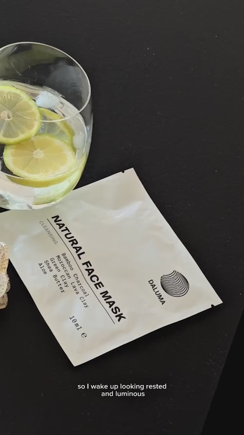 Ein weißes Tütchen mit der Aufschrift DALUMA CLEANSING AKTIVKOHLE FACE MASK in fetter, moderner Schrift. Diese minimalistische Maske enthält Inhaltsstoffe wie Bambuskohle, marokkanische Lavaheilerde, grüne Tonerde und Aloe.